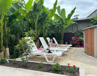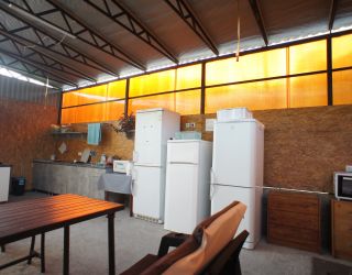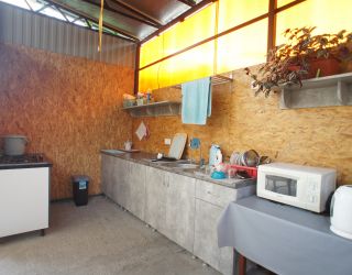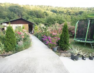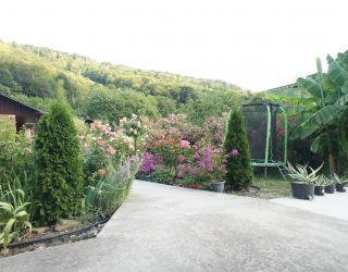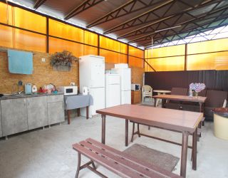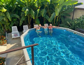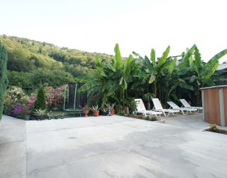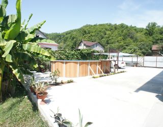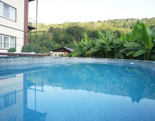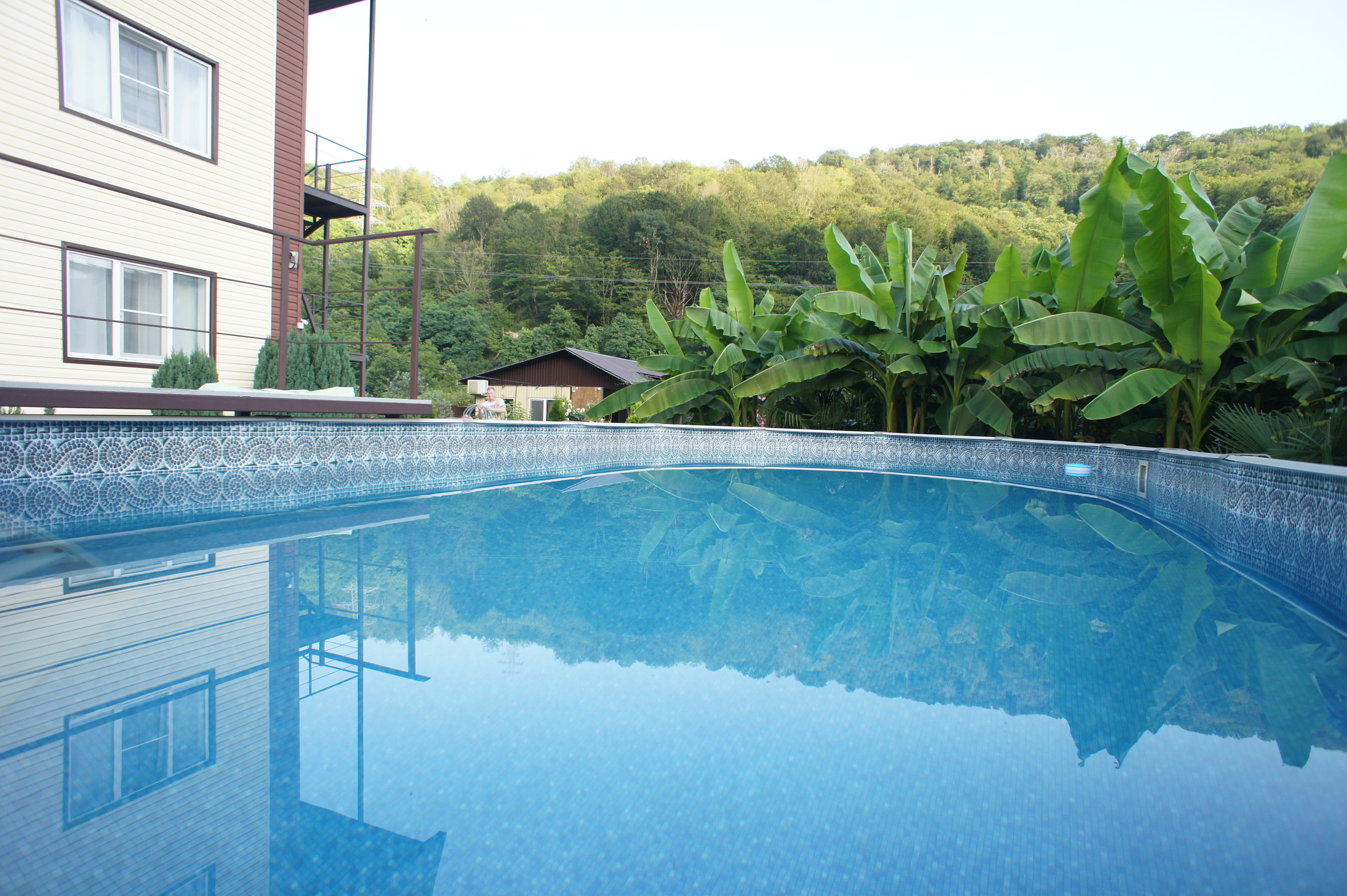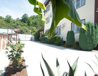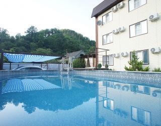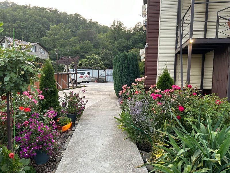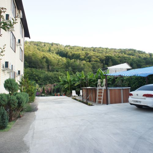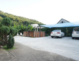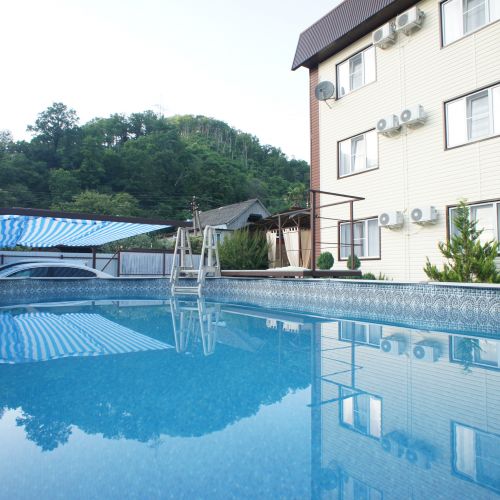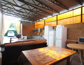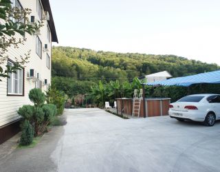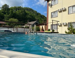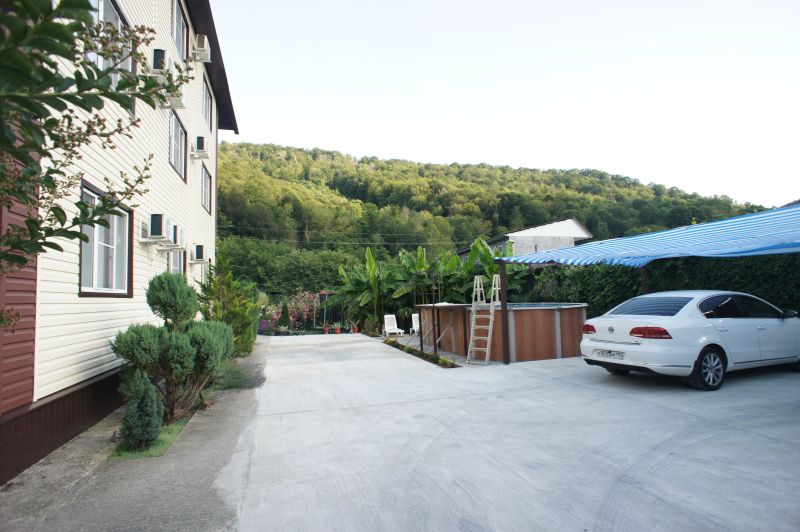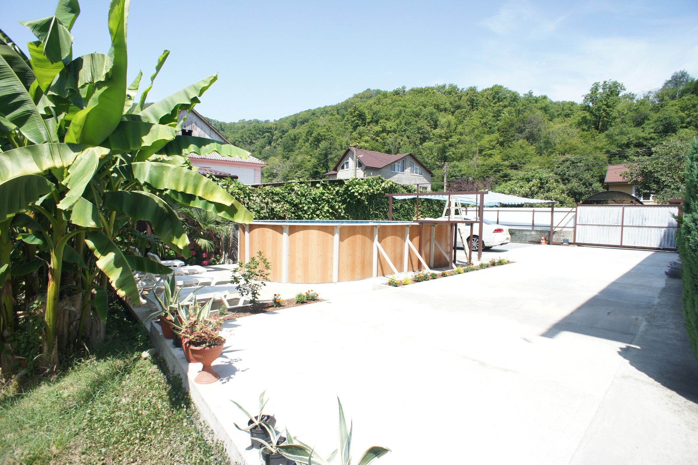На территории гостевого дома оборудованы: полностью оборудованная кухня-беседка общего пользования, беседка с мангалом, парковка во дворе и рядом с домом, открытый бассейн, шезлонги, интернет Wi-Fi, детская площадка, батут для детей.